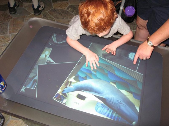 Microsoft Surface was used in various table-tops throughout the attraction, providing access to a variety of entertainment or informational function. Some of the demonstrations involved using the touchscreen to manipulate photographs in various ways, including organization, sizing, cropping, etc. Another really cool example was the use of a Surface table as a big electronic book where you could actually turn the pages by simply moving your hand across the book. The dining room had a demo that was guided by one of the "family-member" performers who showed how various specially designed objects could be placed on the table to trigger specific programs. One example that I recall included a figurine of a fish that triggered an interactive "fish tank" program. Not very practical, but interesting. One thing that I thought was particularly notable was that our 4-year-old very quickly took to interacting with the Microsoft Surface tables and was easily able to figure out the user interfaces.