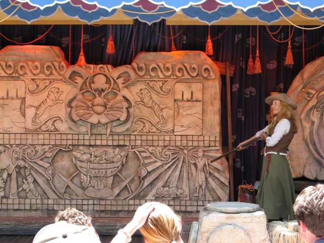 The new show maintains the basic storytelling format as the previous Aladdin show, even though Indiana Jones really isn’t as kid-friendly a basis for such a show. The seating is still set up with a large section of ground-seating in the front for children and then a number of rows of chairs behind for adults (and kids that, like our son, are still timid about sitting by themselves). The storyteller this time is introduced as a female colleague of Indy that enlists the help of the kids in the audience to work out a series of clues that were left behind before Indy disappeared in his quest for a legendary object of great power. Of course, Indy himself eventually shows up at the end after a few kid volunteers have helped out with the various tasks indicated by the clues.