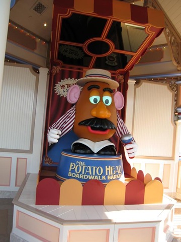 One of the highlights of the ride is actually outside in the queue area. They have an animatronic figure of Mr. Potato Head that serves as an old-fashioned midway barker, giving various speeches intended to attract riders. It does use the voice of Don Rickles (who voiced the character in the movies), but is programmed with a very wide variety of phrases. An operator is stationed somewhere within site of the queue, which allows phrase selection that simulates a limited amount of interaction with the crowd (i.e. referencing the color of someone’s outfit or acknowledging when a joke gets no reaction from the crowd). It is a lot of fun to watch. During our first visit to the ride, our son was so focused on his indecision about the ride itself, that he didn’t really notice the animatronic. By our second visit, it definitely did catch his attention and he was watching it with a big grin on his face. Of course, he then spent the rest of the queue periodically asking us "why was there a talking potato?"