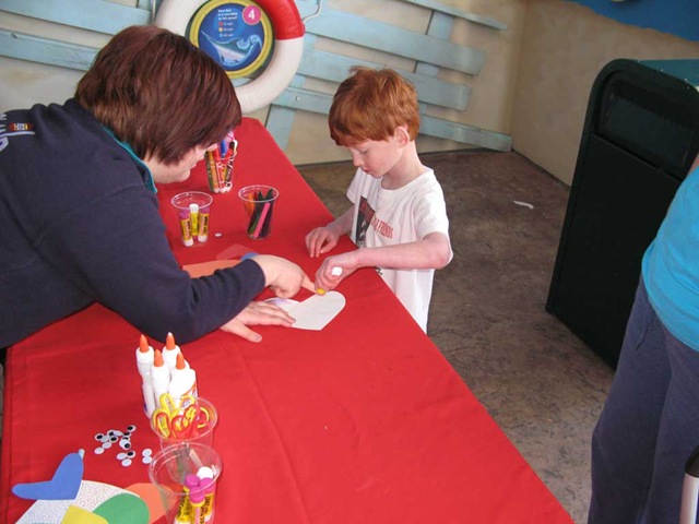 Near the first of the touch pool, there was a craft table set up where kids can do a small art project. Since the day that we visited was Valentine’s Day, the project was to make a fish out of heart-shaped pieces of construction paper. They also had googly eyes and crayons available for additional decoration. This wasn’t anything fancy, but my son enjoyed it and I thought the staff members that they had working this location were very good at interacting with the children. The woman that helped my son was particularly quick to adapt when he decided that he wanted to draw the eyes on his fish instead of use the glue-on eyes.