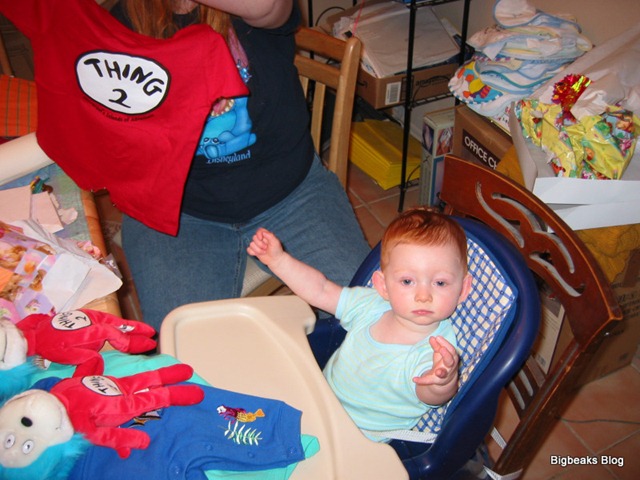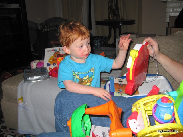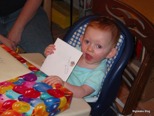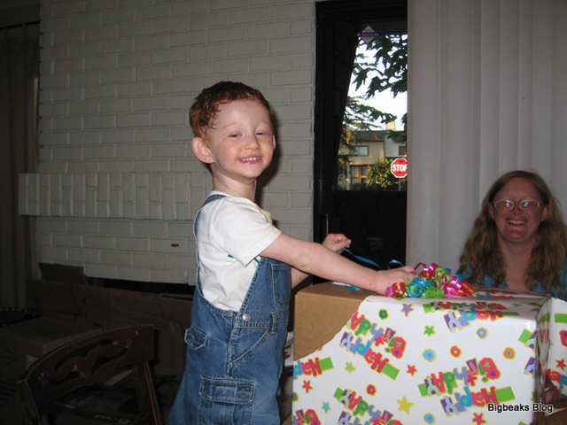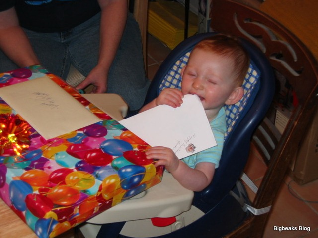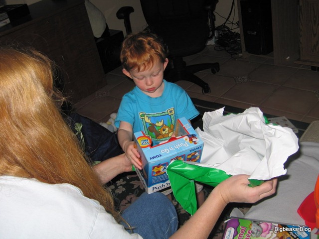 Of course, he also had quite a bit of fun opening his birthday presents, which were mostly toys that year. This was, I think, really the first time that he was very aware that the packages all contained fun things for him. I find it pretty funny that the photos generally show him with such a serious expression of concentration. Opening gifts is serious business!