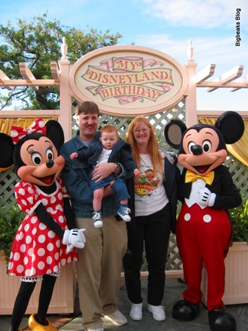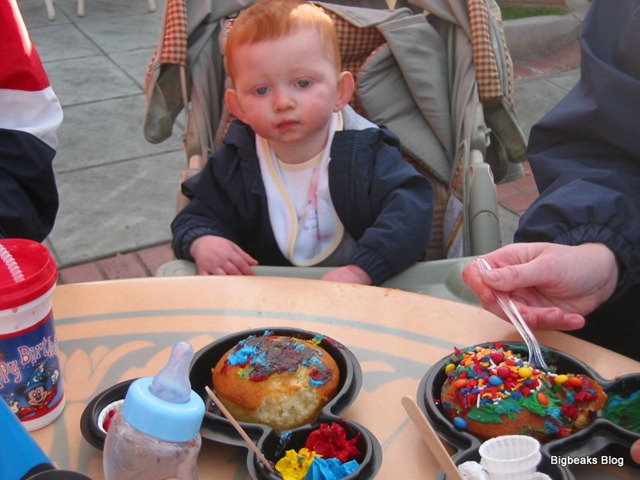 To celebrate his first birthday, we attended the Disneyland Birthday Celebration that they offer a couple times a day at the Plaza Inn restaurant on Main Street. At this event, everyone gets an undecorated cupcake along with small cups containing frosting and sprinkles to use to decorate them. A character named Pat E. Cake hosts the event and Mickey and Minnie Mouse also pay a visit. Quite a few of our friends were able to join us at the park for the party as well.