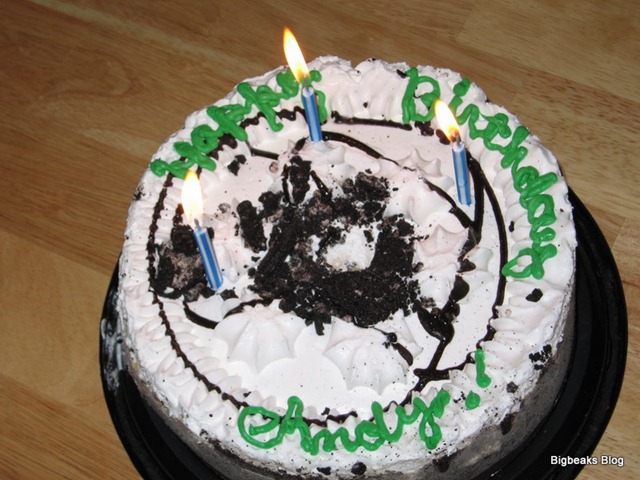 For this birthday, we bought an ice cream cake from the grocery store, which he enjoyed very much. In fact, the ice cream cake has now become something of a birthday tradition for the family. Generally, Andy wants us to get one for his birthday each year and also strongly encourages my wife and me to have them for our birthdays as well. It looks like I somehow didn’t get any pictures of the cake that year, but I did get several of him eating it and the aftermath.