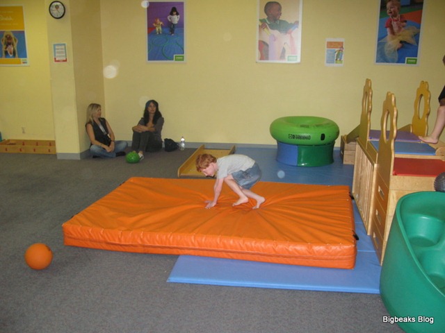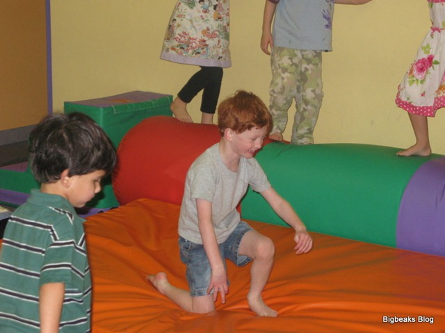 The majority of the kids from his pre-school class as well as a few of the Gymboree students attended the party, resulting in a turn-out of around 20 kids. The Gymboree teacher and an assistant did an excellent job running the event, which had a great mix of organized play activities and free play. The kids all seemed to have a great time and the parents seemed to enjoy watching them!