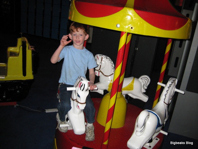 Andy was still kind of pushing for having the party there, but we were able to placate him by promising a family visit there not too long after his birthday. We ended up going up there the weekend after his birthday for dinner and ice cream, inviting a few of our adult friends to meet up with us there as well. Of course, Andy again got in a bunch of rides on the little merry-go-round.