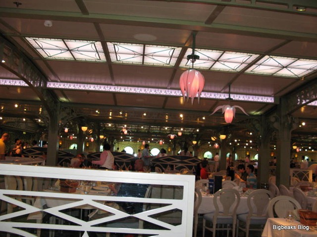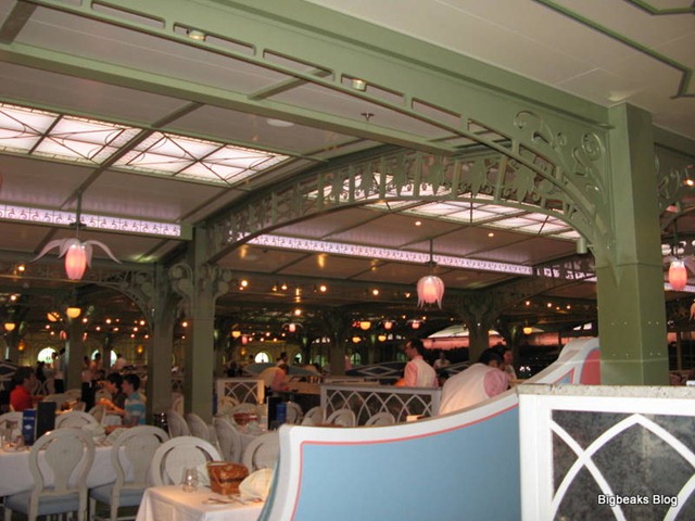 Another complaint we had was that Enchanted Garden is simply a bit too large for the theming to fully be experienced by all guests. The show element of the restaurant is that the decor is supposed to change from daytime to night over the course of the meal. This is mainly done through projections and lighting in faux windows located in the center back of the restaurant. Our table was close to the front and on the far side, so I can’t say we really noticed that transition much. Our table was also right next to a port hole, which caused real outside lighting to overwhelm the themed lighting.